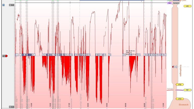 In seltenen Fällen gibt es jedoch auch einen nicht sauren Reflux, der mit einer alleinigen 24-Std. BRAVO-Kapsel-pH-Metrie nicht erfasst werden kann. Dieser nicht saure Reflux kann mit einer sog. Impedanzmessung erfasst werden.